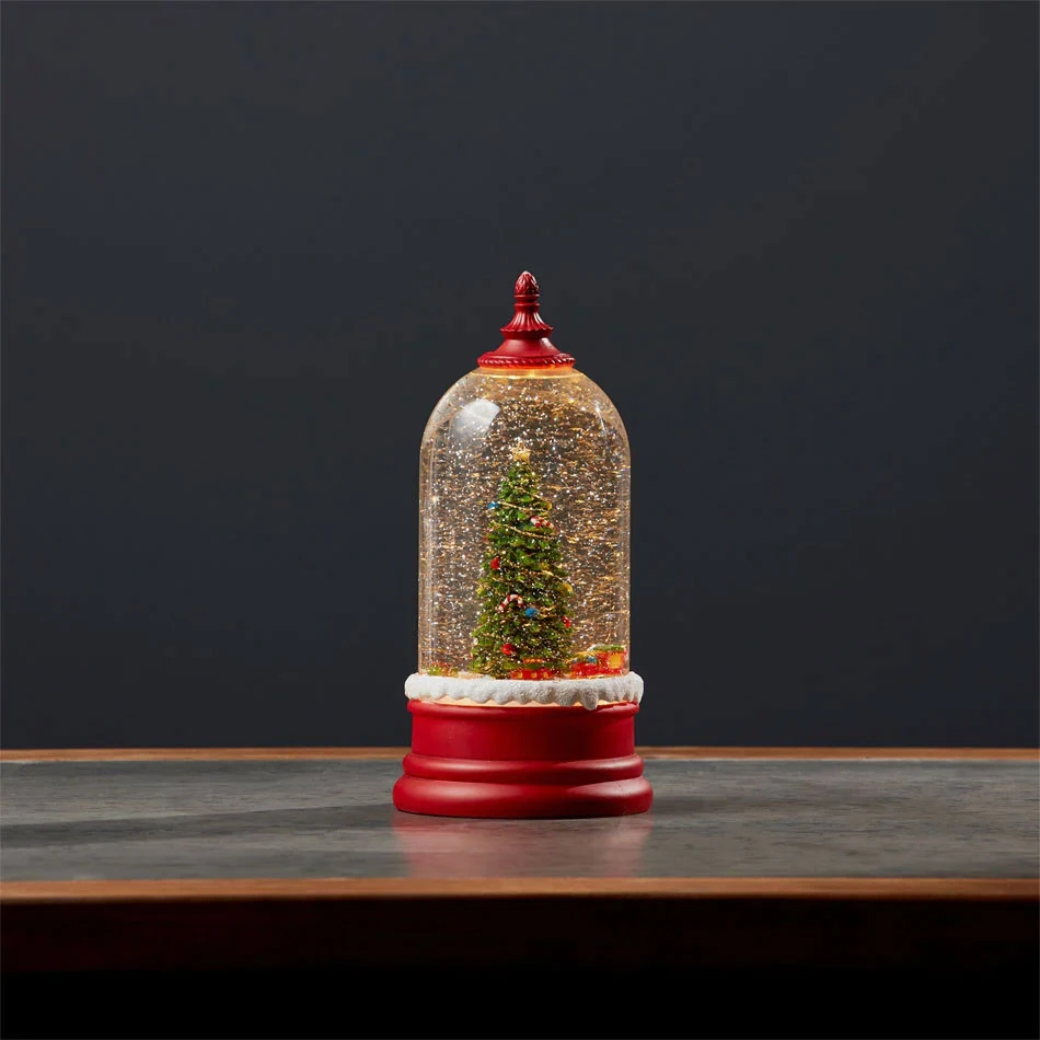 Inside our 10.5 inch Red dome water lantern decorated Christmas tree with a train moving round and round the tree in swirling glitter. When turned on a warm LED shines on the figurine and swirling glitter to gives our Christmas globe a whimsical look for the Christmas Holiday season.Â