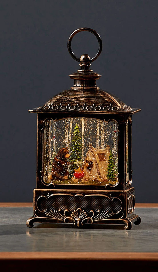 Bears at the campfire scene water lantern. A large bear cooking a fish over a campfire with a bear peaking out of the tent, in swirling glitter with evergreens, birch trees and cardinals in the background. When turned on a warm LED shines on the figurine and swirling glitter to gives our Campfire Christmas globe a whimsical look for the Christmas Holiday season.Â