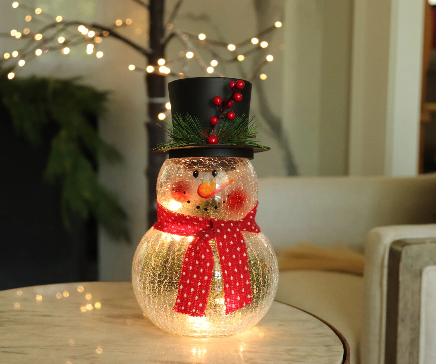 Inside the crackle glass are red berries, evergreens and 10 bright lights. Place one in your kitchen or bathroom to use for a nightlight, or light during a holiday party. Enjoy our lighted crackle glass snowman for this upcoming holiday season.