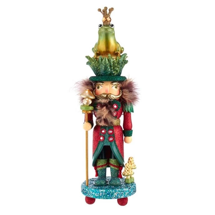 Designed by renowned artist Holly Adler, Hollywoodâ„¢ Nutcrackers is a whimsical collection of nutcrackers, and features a variety of designs including Christmas, fantasy, and everyday nutcrackers. This nutcracker is dressed in a red and green glittered outfit with a mushroom staff and a large frog wearing an embellished crown for a hat.